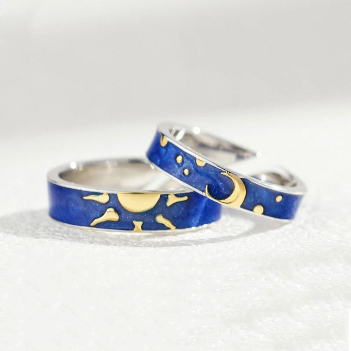 2 peças, joias modernas, românticas, azuis, presentes de dia dos namorados, casamento, anéis de casal, Van Gogh, céu estrelado ajustável, Metal, Sem pedras preciosas.