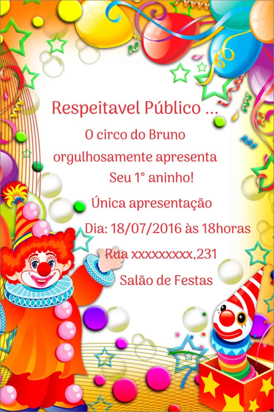 Você pode personalizar o seu convite de acordo com o que você achar melhor para sua festa, as sugestões acima são como o nome já diz meras sugestões. modelos prontos de convites online Circo para você editar, baixar, e enviar gratuitamente pelo Whatsapp, Facebook ou até imprimir.