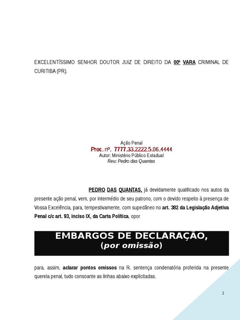 Modelo Embargos de Declaração Criminal Sentença (Lei) Crimes