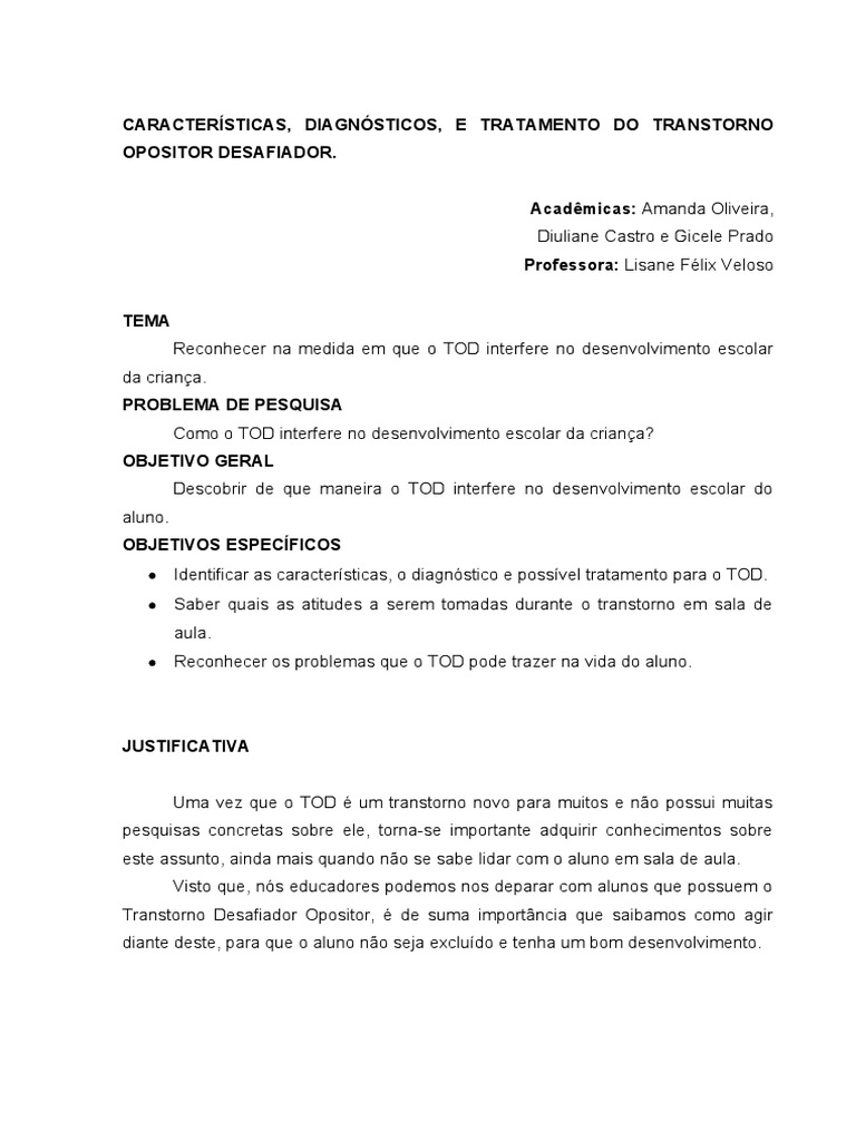 Transtorno de Oposição Desafiante D.2 1 TRANSTORNOS EXTERNALIZANTES TRANSTORNO OPOSITOR DESAFIANTE Katie Quy & Argyris Stringaris Edição em Português. opositor desafiador (TOD) como um padrão persistente de comportamento desafiador, opositor e antagonista em relação a adultos. Esse transtorno é definido pela ausência de