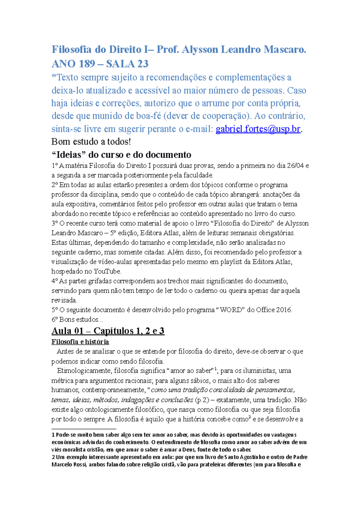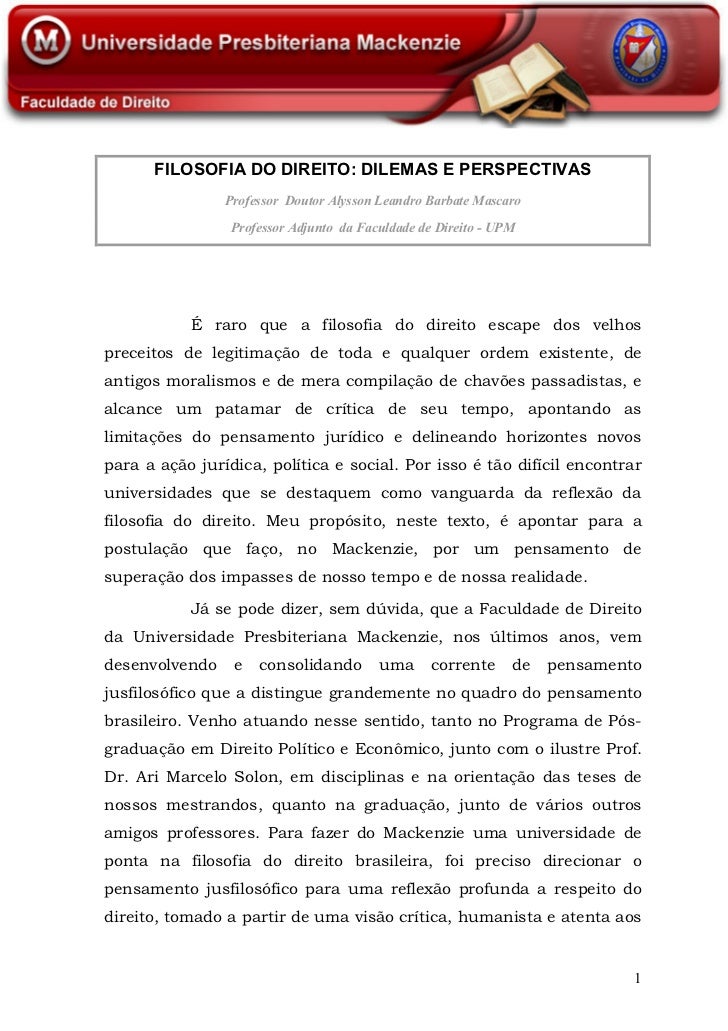 O livro Filosofia do Direito apresenta os momentos mais importantes da história da Filosofia do Direito, desde suas origens gregas,. Alysson Mascaro. É Professor da Faculdade de Direito da Universidade de São Paulo (USP), o tradicional Largo São Francisco. Doutor e livre-docente em Filosofia e Teoria Geral do Direito pela USP, onde se.