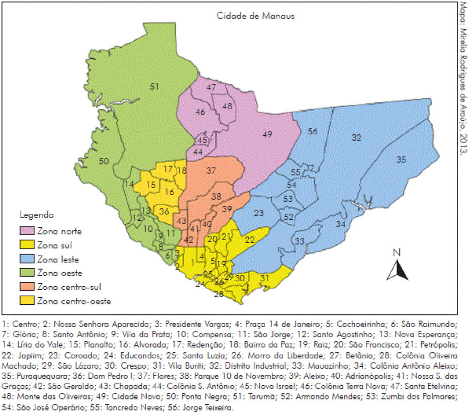 BAIRROS DE MANAUS . Esta é uma lista dos bairros de Manaus, com seus sub-bairros, cada um categorizado em sua respectiva zona.Os nomes dos bairros oficiais, sua numeração correspondente e o desenho no mapa foram feitos de acordo com a Lei que delimita os bairros do municipio, Lei Municipal 1401 de 14/01/2010. Zona Norte (Amarelo)Zona Leste (Azul-escuro)