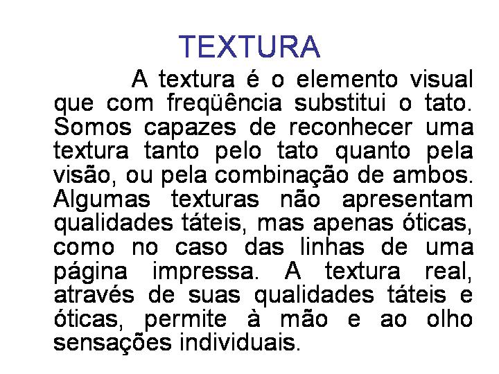 O objetivo deste trabalho, é que o leitor possa compreender o que é a textura em si, e como é feita a aplicação desta técnica no nosso convívio. 2. HISTÓRIA A textura é o elemento visual.