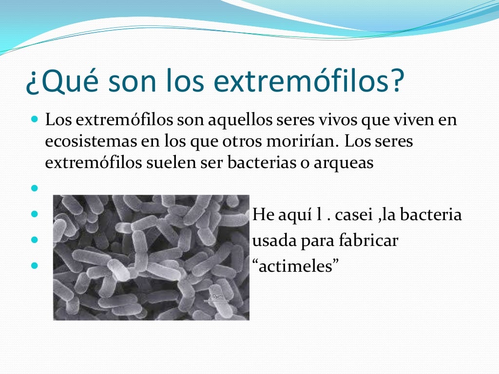 O estudo destes organismos abre novas perspectivas na pesquisa básica e aplicada e pesquisa industrial em todo o mundo , por esta razão, uma revisão geral dos tipos de organismos extremófilos e ambientes , onde pode encontrar é realizada. PALABRAS CLAVE. Extremófilos, termófilos, halófilos, quimiolitrótofos, acidófilos . KEY WORDS