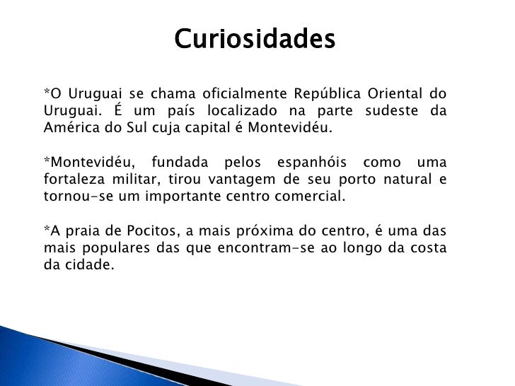 O Uruguai é um pequeno país sul-americano localizado entre a Argentina e o Brasil. O país é banhado pelo oceano Atlântico e também pelo rio Uruguai. A geografia local é marcada pelo clima subtropical e pela vegetação de campos. O Uruguai, curiosamente, alcançou sua independência do Brasil, mas também foi colonizado por espanhóis e.